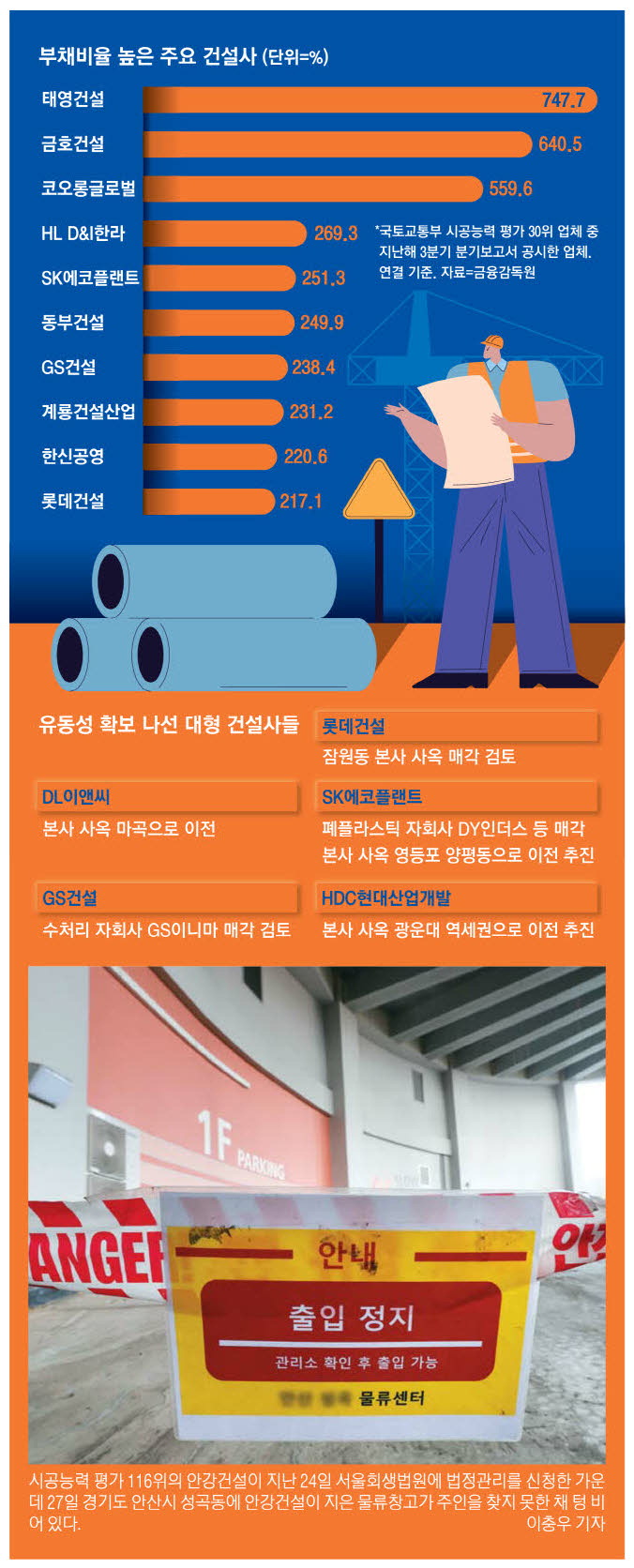 이러한 움직임은 건설경기 침체가 장기화하면서 건설사 재무 구조가 취약해지고 있기 때문이다. 지난해 3분기 보고서를 공시한 국내 30대 건설사(국토교통부 시공능력 순위 기준) 부채비율을 보면 GS건설과 롯데건설, SK에코플랜트, 계룡건설산업, 동부건설, 한신공영, HL D&I한라 등이 위험 수준인 200%를 넘겼다. '잠재적 부실 징후'로 판단되는 400%를 상회하는 곳도 워크아웃 중인 태영건설과 금호건설 등 3곳에 달한다.